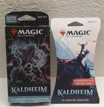 First it was a Kaldheim prerelease kit. He liked the new cards, seemed to like the set, and genuinely seemed to enjoy the games we played. And within a few days, all interest seemed extinguished – as had happened multiple times before. So I made him an offer: build a new deck from his full collection, play some more Magic with me, and we’d open some Kaldheim Set and Collector boosters as “prize packs.” He claimed interest, and then for over a week repeatedly told me he’d build his new deck “soon” when I asked how the process was going. Out of desperation, I tore the plastic wrap off the Collector box, took a couple packs out, and set them, and a couple Set boosters, on the kitchen table next to where he eats.