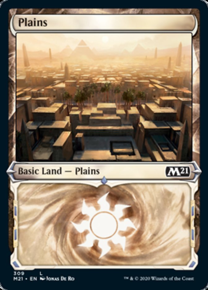 The two prize packs I open contain Runed Halo and Volcanic Salvo – neither particularly exciting (in fact, the Salvo is the second least valuable rare in the set currently, behind only…Pursued Whale.) There was also a very cool foil plains in the M21 showcase frame.